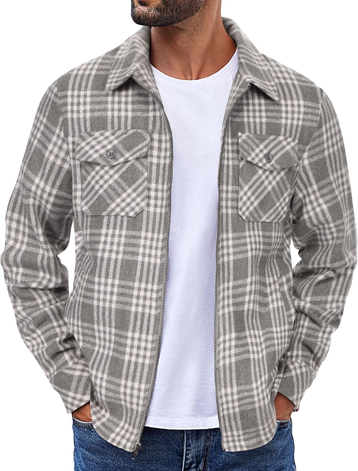 • Mens Casual Zip-Up Jackets: Featuring a classic plaid/checkered pattern, these plaid shirts shacket come with adjustable cuffs and a convenient full zip-up design, allowing for easy wear and removal. The two spacious front pockets offer ample storage for all your essentials