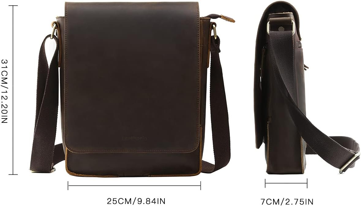 • Style: Leather Men’s Crossbody Shoulder Bag. Material : Retro Genuine Leather (head layer of crazy horse skin); Lining: Canvas; Dimensions : 25 x 31 x 7 CM ,9.84 x 12.20 x 2.75 IN. Weight: 0.98 KG.Using hidden snap closure; Adjustable shoulder strap
