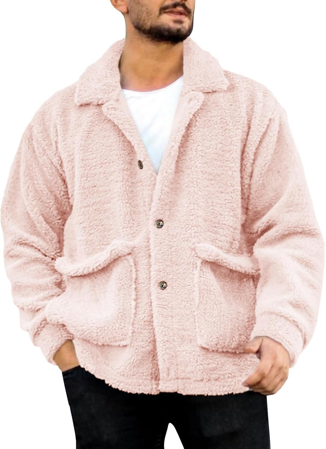• Features: Casual jacket for men, basic design, solid winter fuzzy coat, side pockets, long sleeve, lapel collar, button down, button closure allows for easy wearing and removal, the stand collar rovides added protection and warmth for your neck, shielding you from chilly winds.