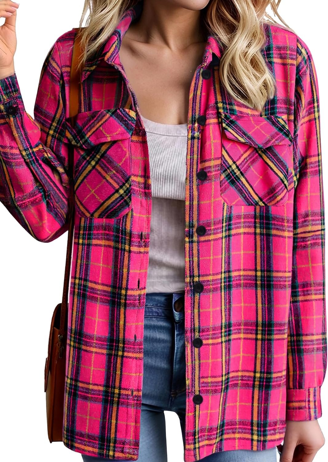 • Design: Basic button up womens flannel shirt, It can be worn alone or as a stylish womens shacket, buttoned up or open and not feel restricted. Classic long sleeve blouses for women, you can also roll up the sleeves and turn them into 3/4 sleeves. The collared neck looks formal, v-neck to make you more sexy and two chest pockets gives you a casual feel. Loose button up blouses never go out of style.