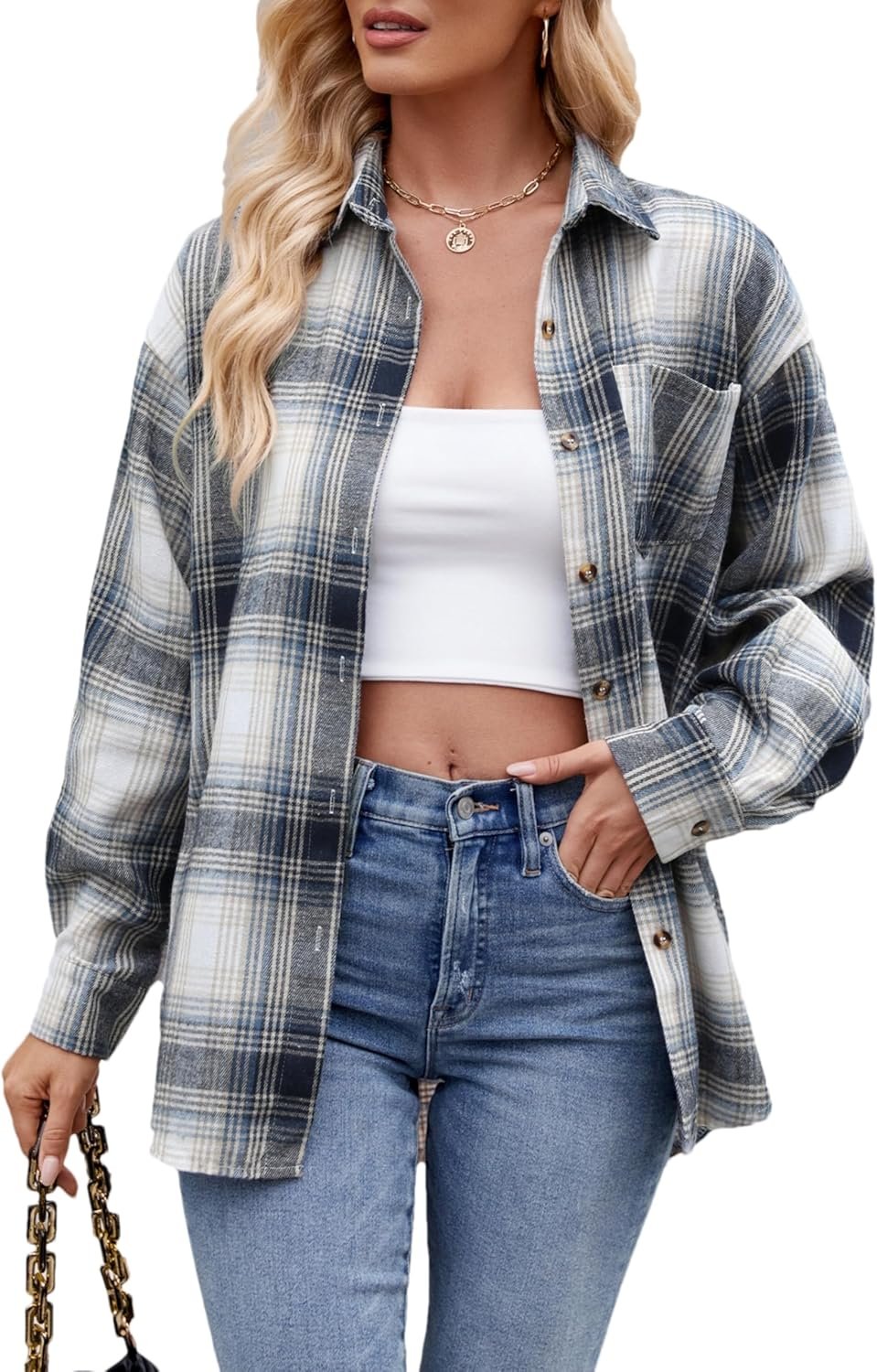 - Features: Roll up long sleeve, collared, button down, one chest pocket, single breasted, drop shoulder, stripe and plaid pattern