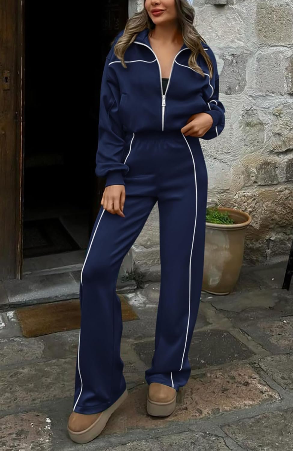 - Fashion Design – This Basic 2 Piece Set For Women Includes A Zip Up Sweatshirts And High Waist Wide Leg Long Pants. Exposed Seam Combine With Solid Color Design, Which Makes The Jogger Sets More Fashion And Active. Side Pockets On Sweatshirt And Pants Are Convenient For You To Carry Somthings While Keeping You Hands Warm On Cold Days