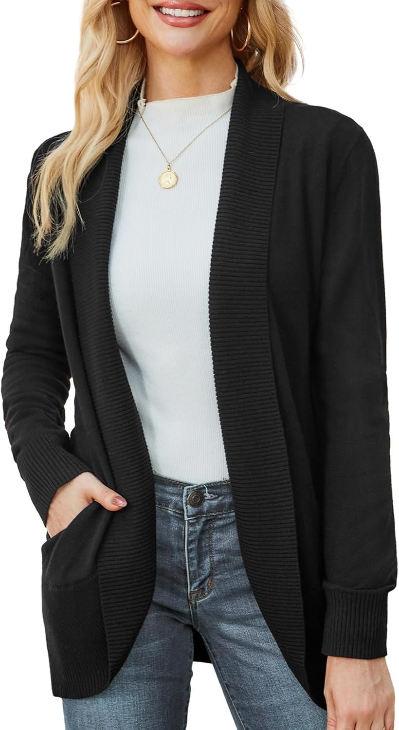 - Design Details: Long sleeve cardigan features an elegant lapel collar and two side pockets, no zipper/button, solid color. Open front design with curved hem create a graceful, flattering silhouette for any body type